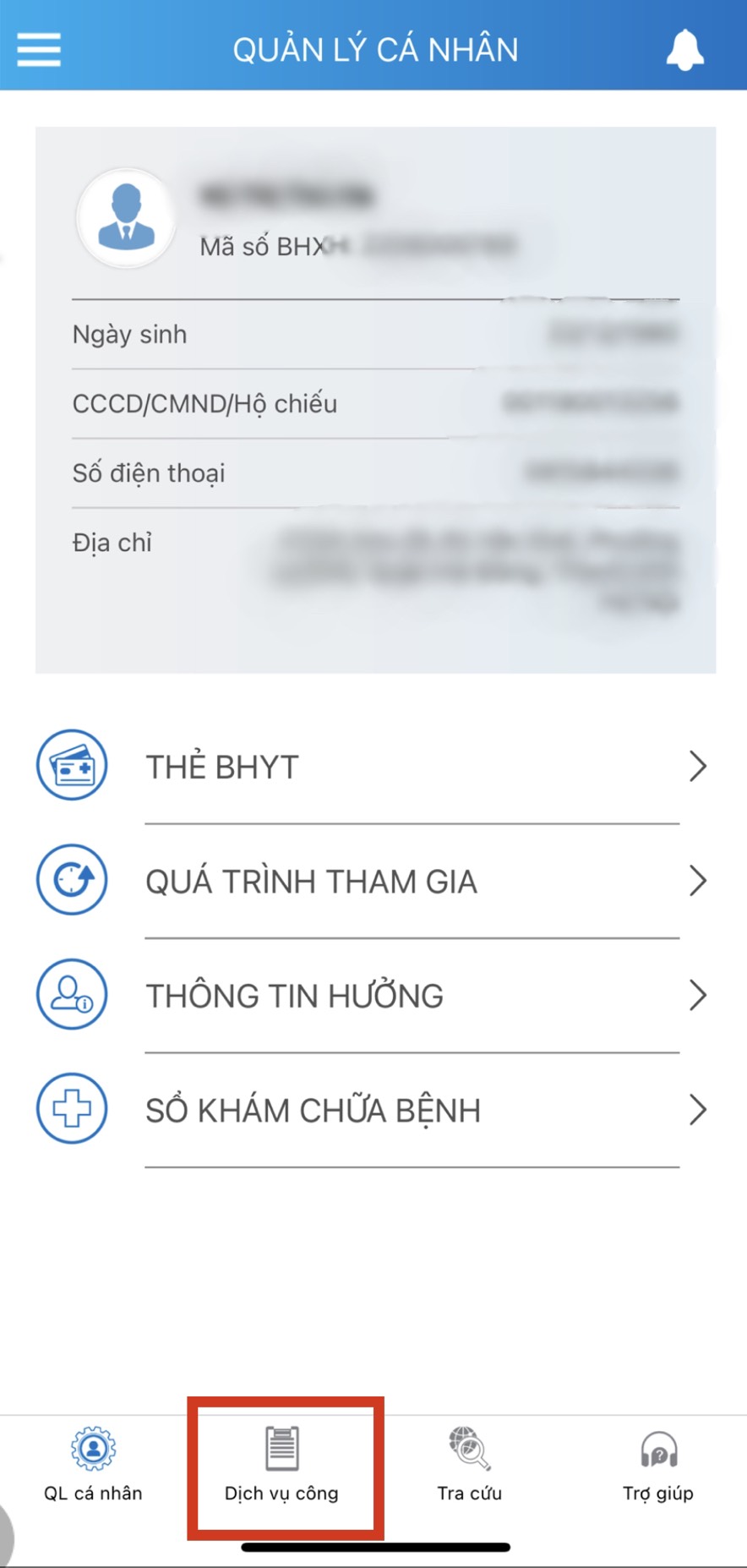 Bước 2: Màn hình xuất hiện giao diện Quản lý cá nhân, nhấn chọn “Dịch vụ công”.